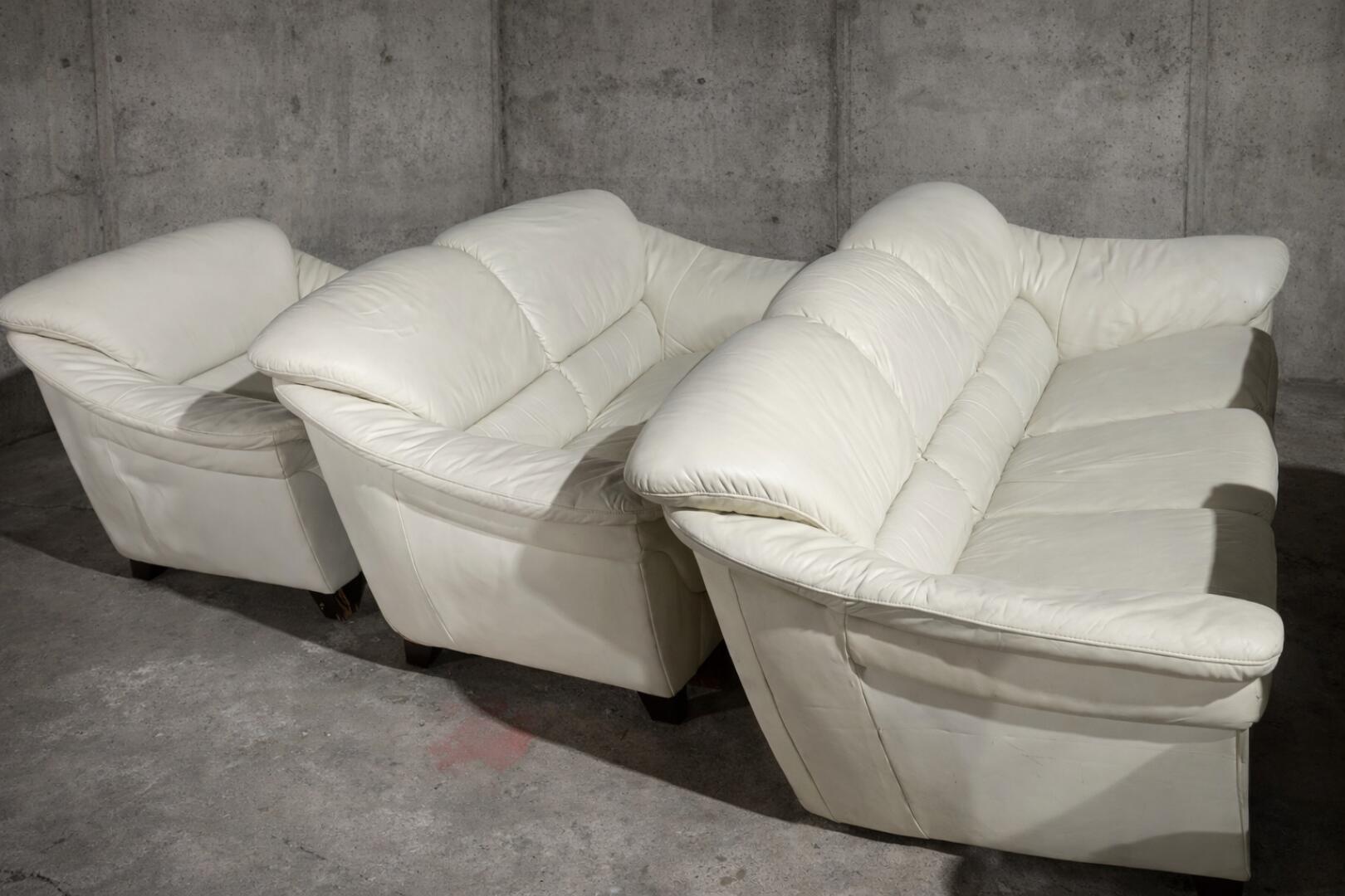 Zestaw mebli ze skóry naturalnej : kanapa trzyosobowa, kanapa dwuosobowa oraz fotel. Meble w dobrym stanie , bez przetarć, odbarwień. Kolor śmietankowy .